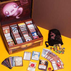 Also containing a D6 (complete with Isaac's face!), a D8, 100 'tainted' plastic pennies, 10 plastic nickels, a ‘tainted’ coin bag, heart and tear tokens, and card dividers to keep your collection organised, this mega collection comes with everything you need to get playing right away! Discover killer combos, enhance your abilities, betray your companions, and win!