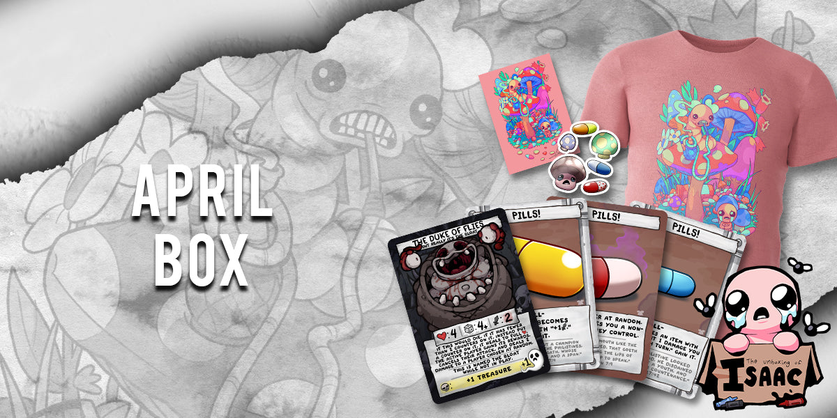 A unique monthly subscription program that gives the fans a chance to get their hands on cool, new The Binding of Isaac-themed t-shirts, Four Souls cards and special merch drops. Featuring collaborations with prominent artists like Tom Bunk, Daniel Shaw "sawblade666", Jimbo Phillips, Angela Ho, Sr Pelo and many more.