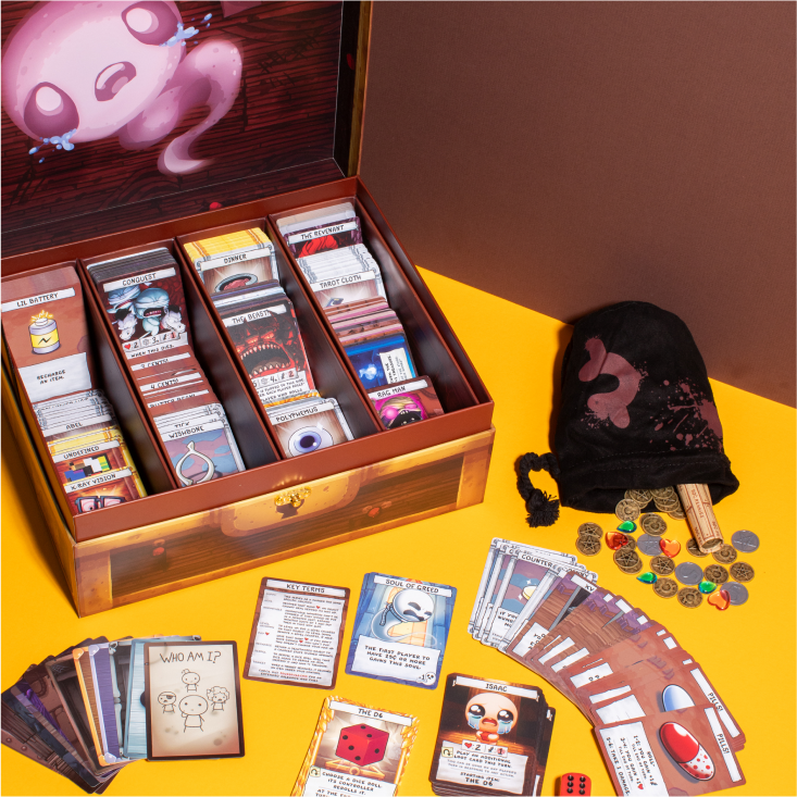 The Binding of Isaac: Four Souls is a tabletop card game about sacrifice, betrayal, and hoarding inspired by the massive hit video game The Binding of Isaac and designed by the one and only Edmund McMillen. Experience the iconic world of The Binding of Isaac through a unique tabletop experience full of cooperation, bartering, and betrayal. Collect treasure, gather loot, defeat monsters, and be the first to collect four souls to win! You’ll discover unique and powerful items, loot, and synergies as you try and swing fate in your favour, navigating exciting twists and turns as you race your friends to victory!