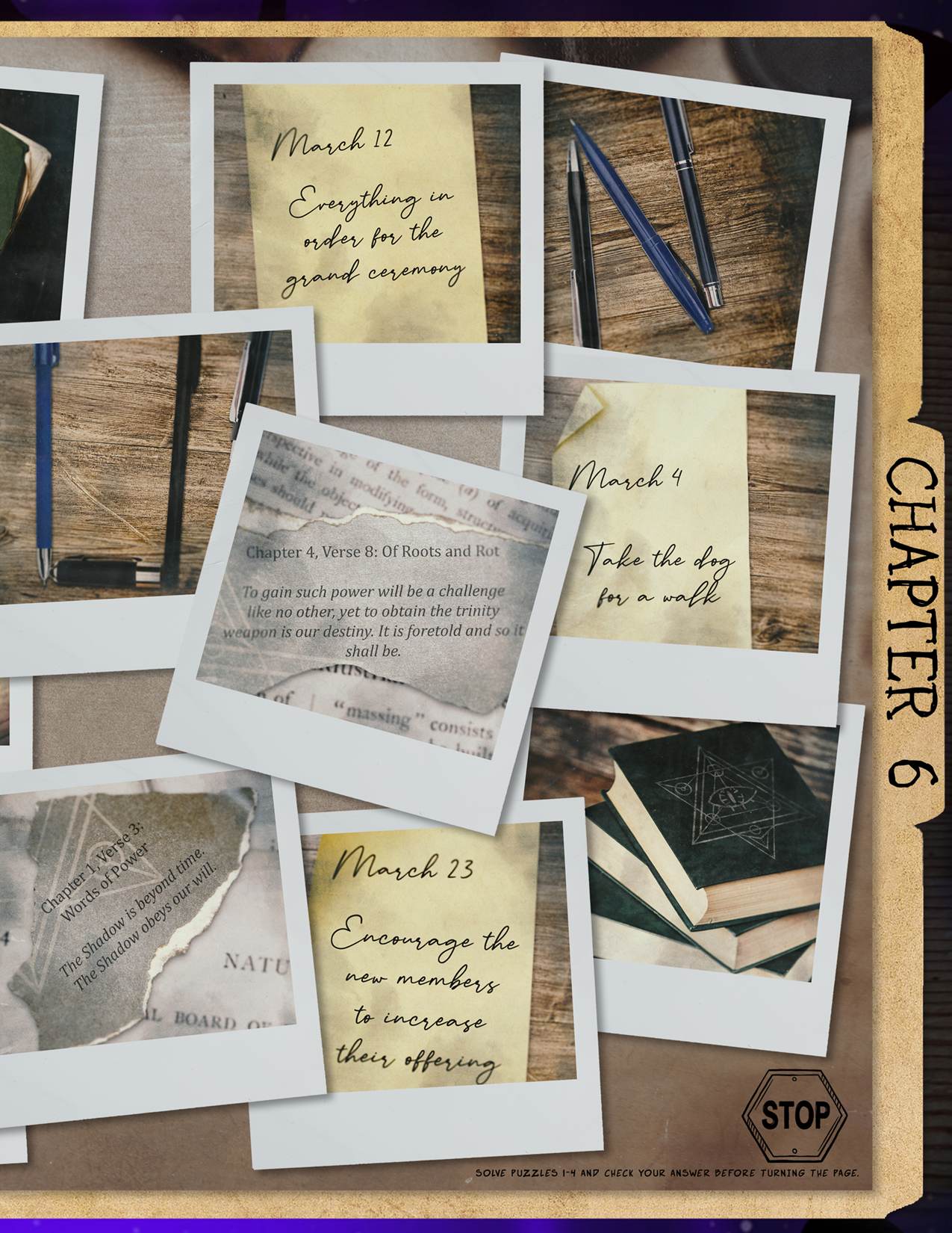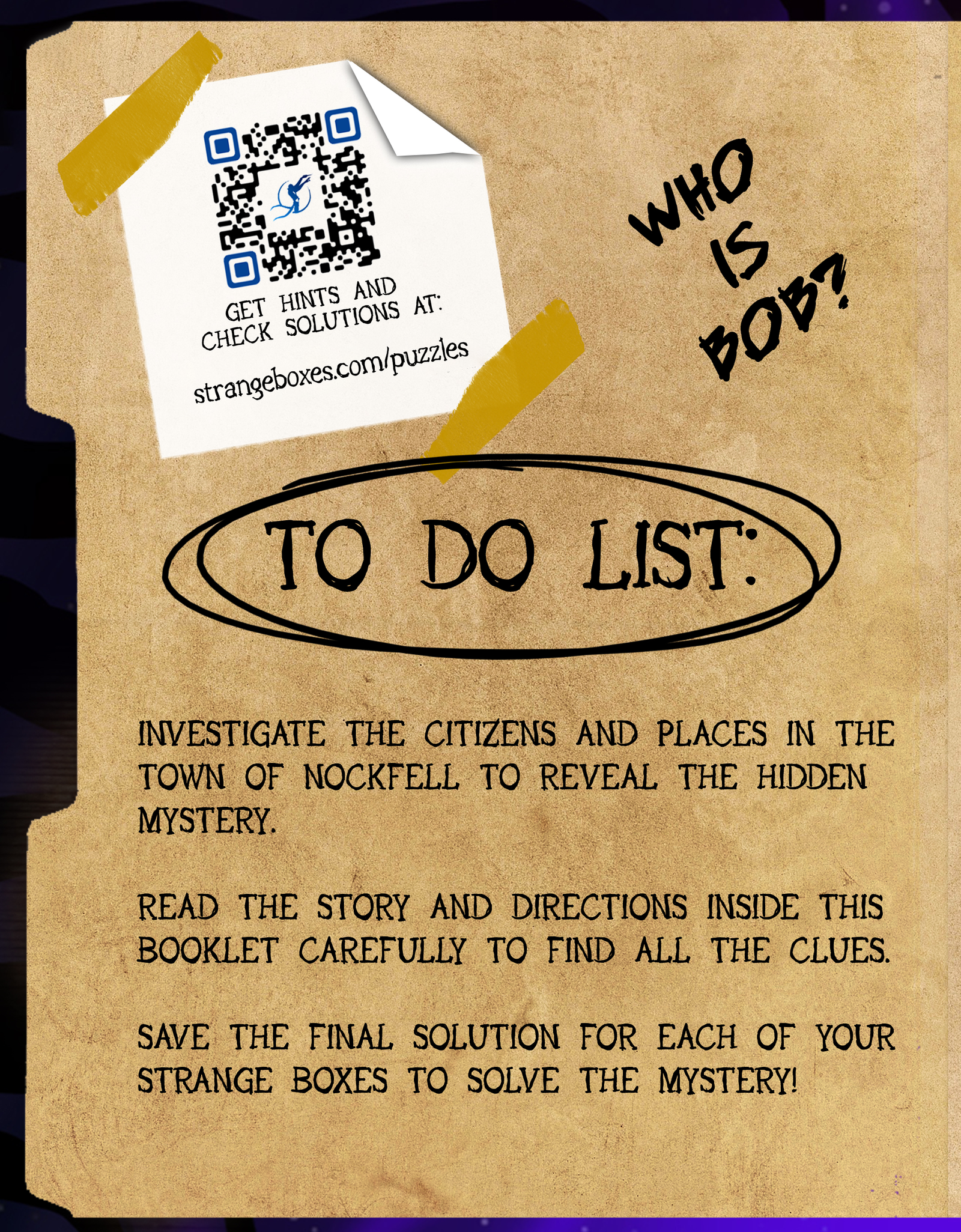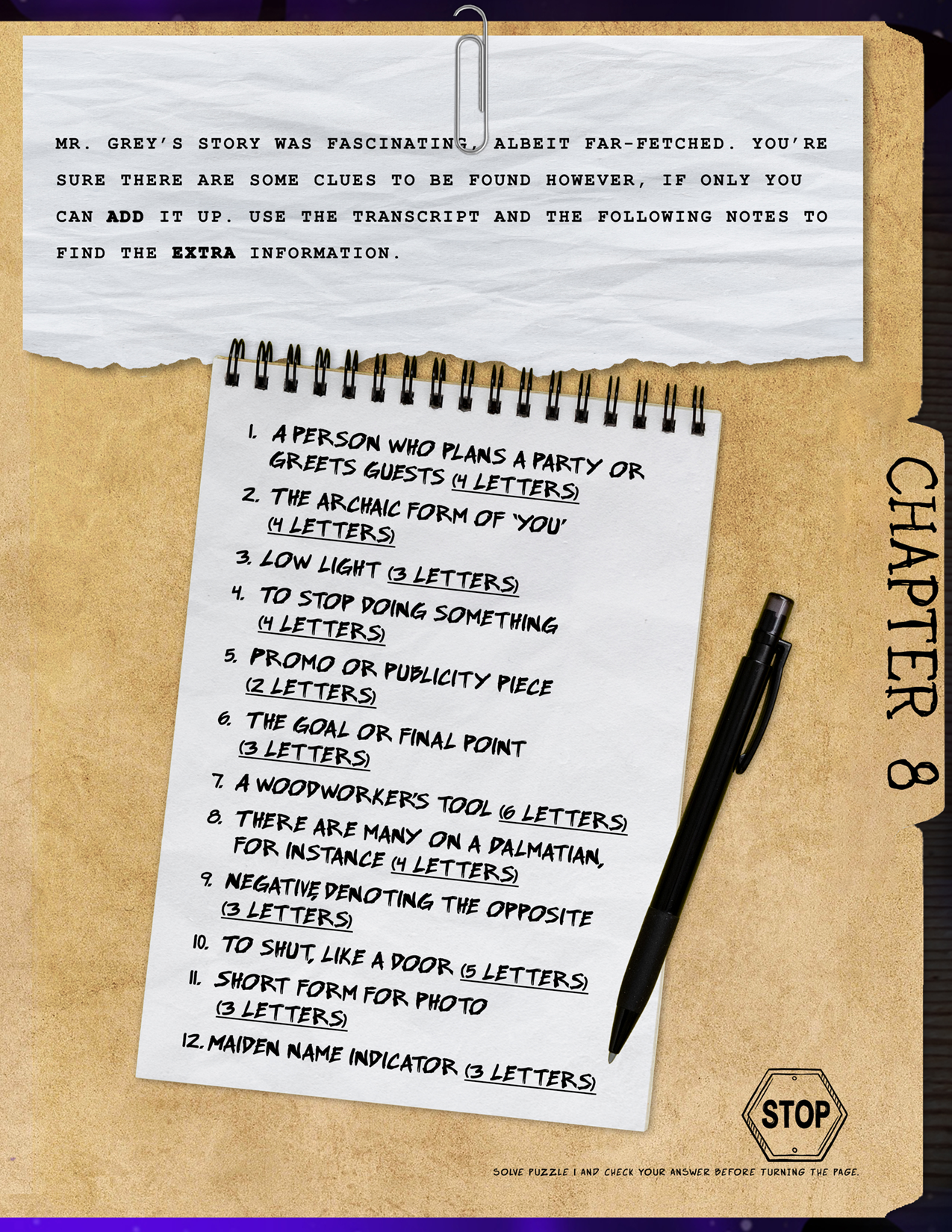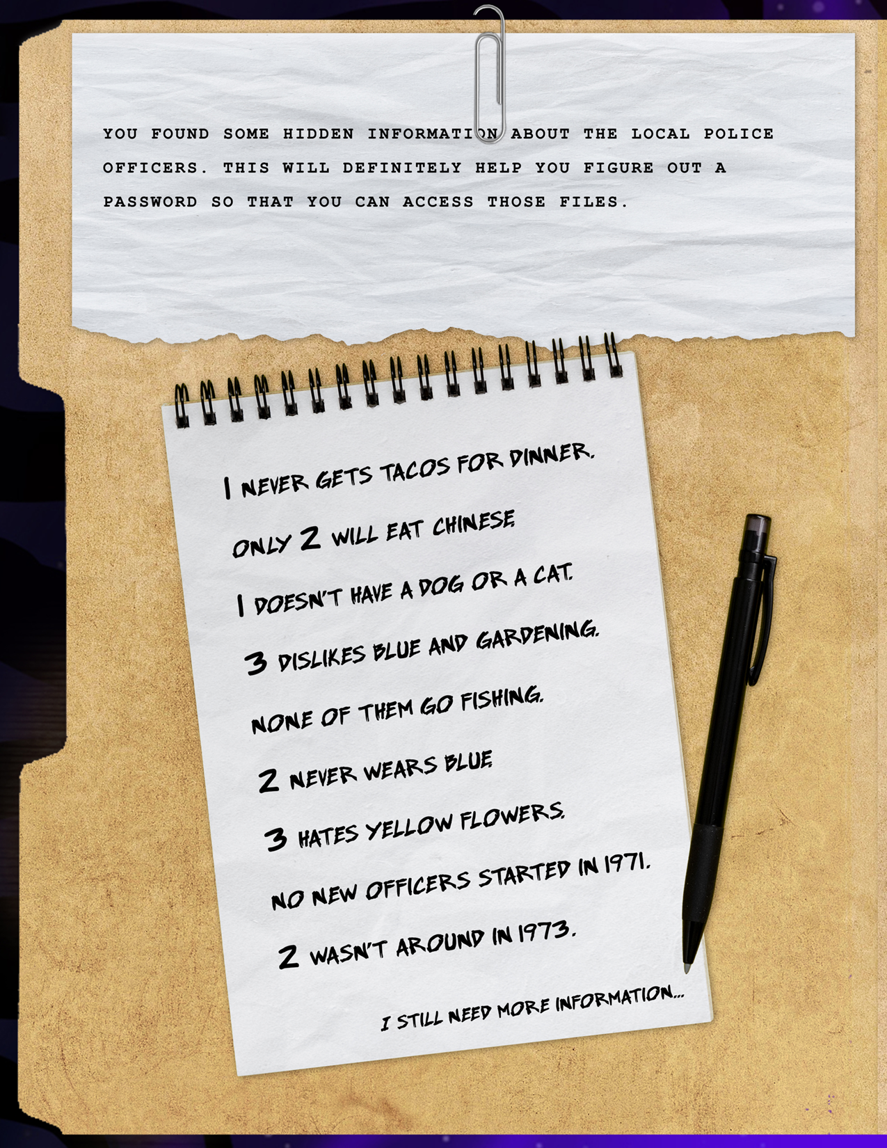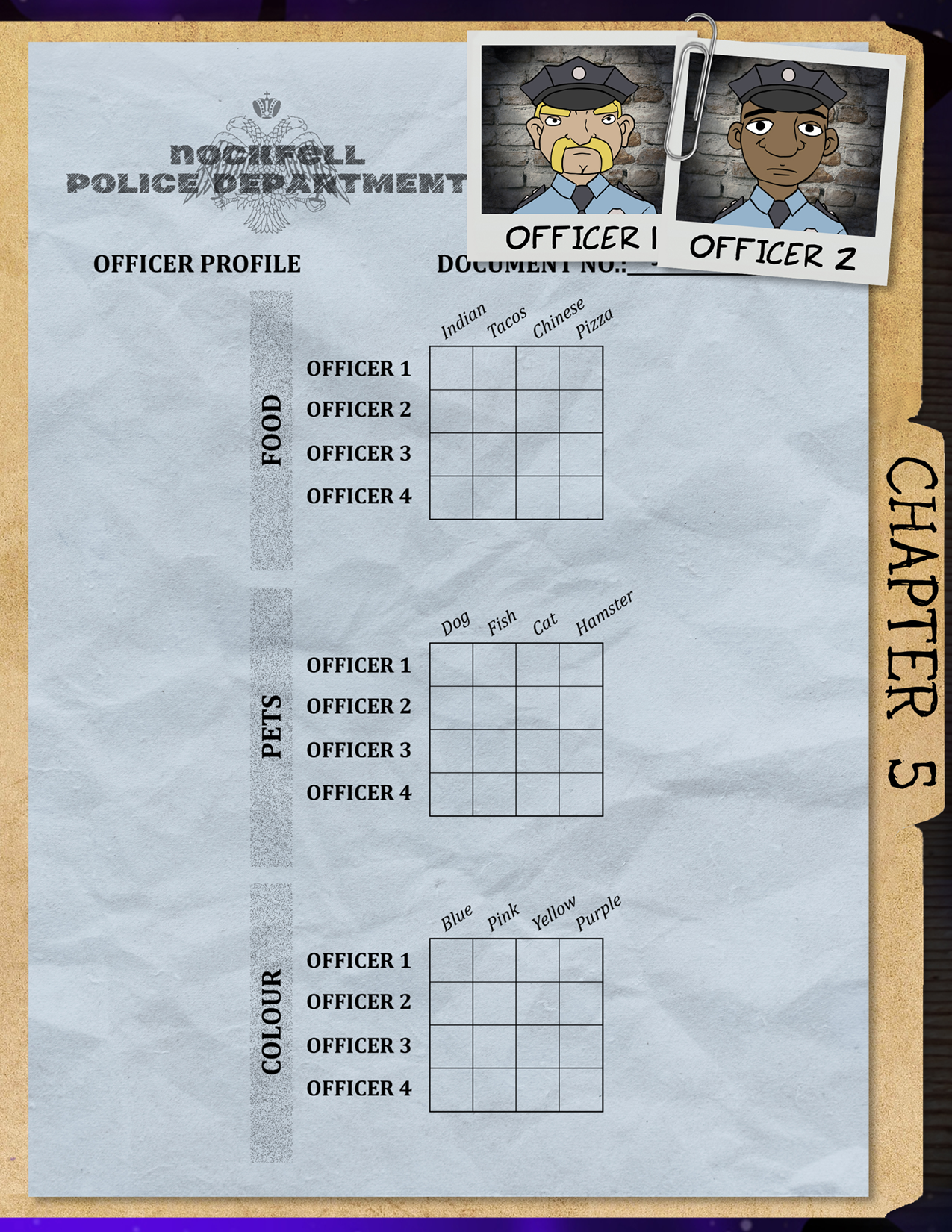 Disassemble the entire box to find the other half of the clues. Go through these clues and the clues in the booklet, crossing off on the grids when an officer DOESN’T do something. I.e. If an officer doesn’t eat tacos, they get an X under tacos. After all clues are filled out, each grid should have X’s in the shape of a letter.