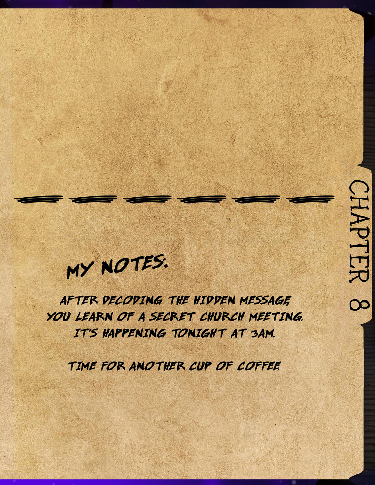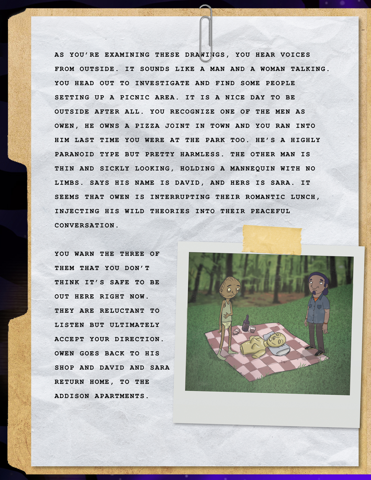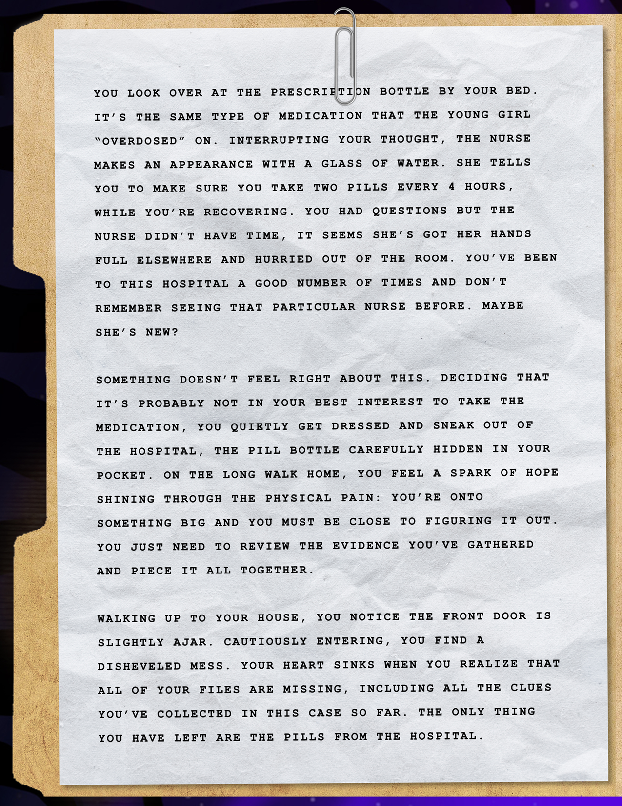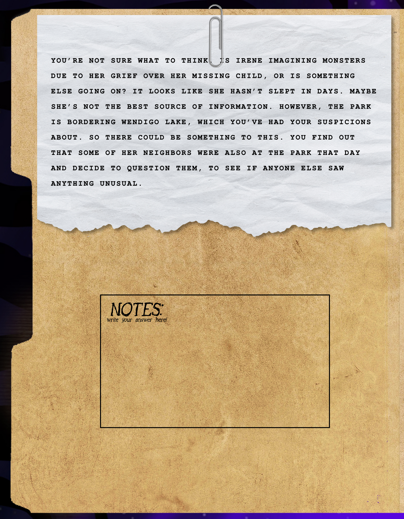 Your intuition says something big is happening here, and you’re determined to get to the bottom of it. For now, your soft pillow is calling to you. It’s been a long day. Tomorrow, you’ll search the woods yourself.