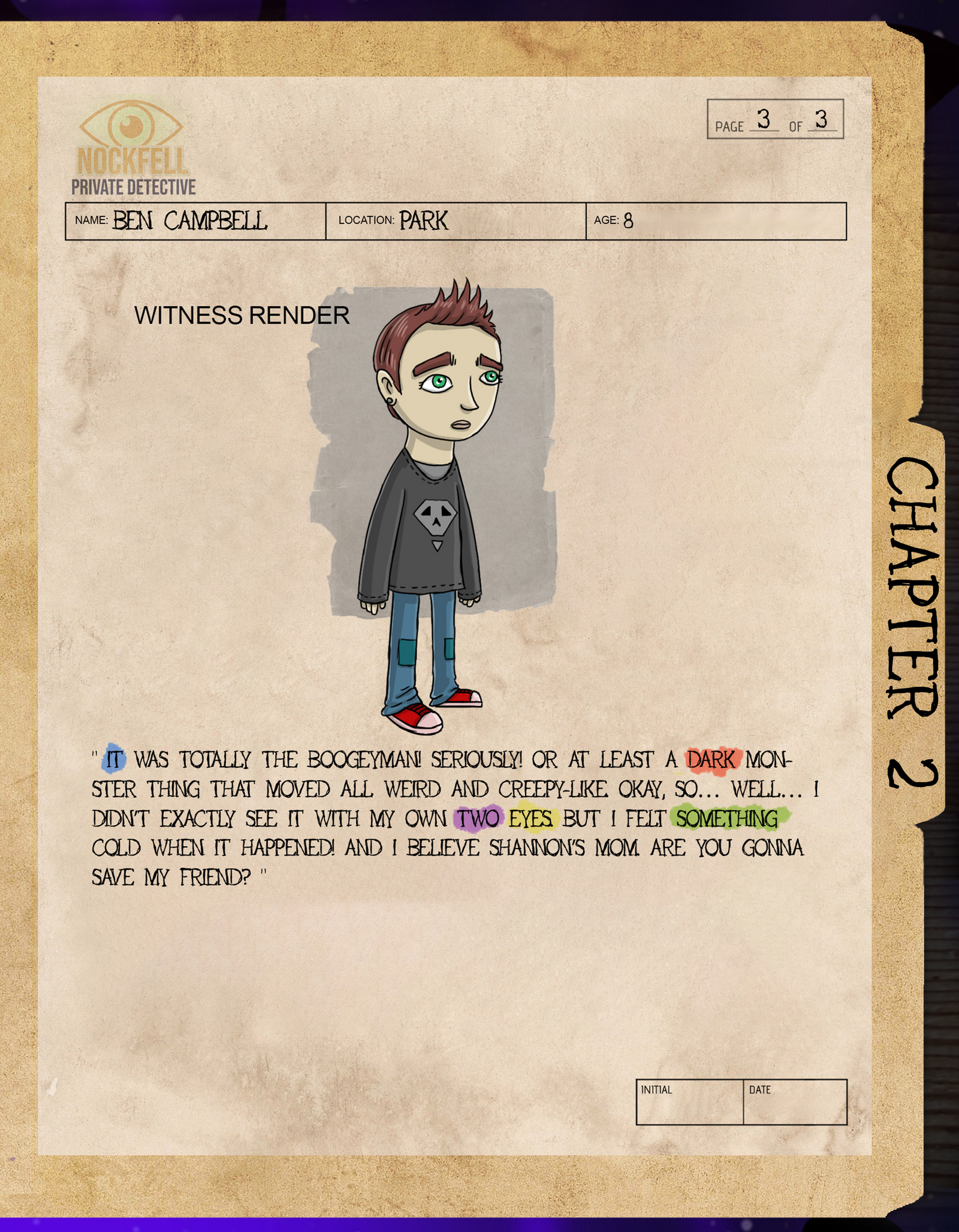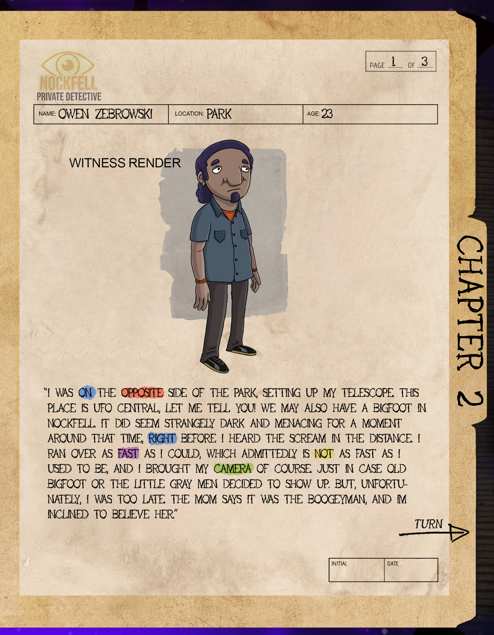 Find the first red word in each witness statement. This gives you OPPOSITE OF DARK. What is the opposite of dark? The final solution is