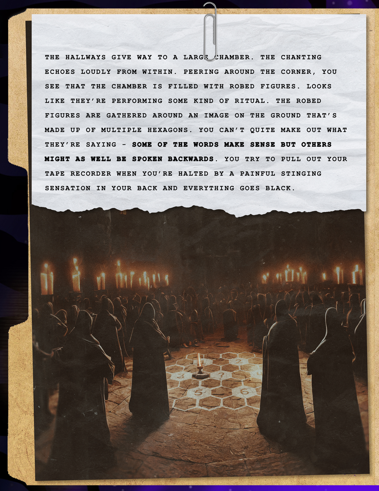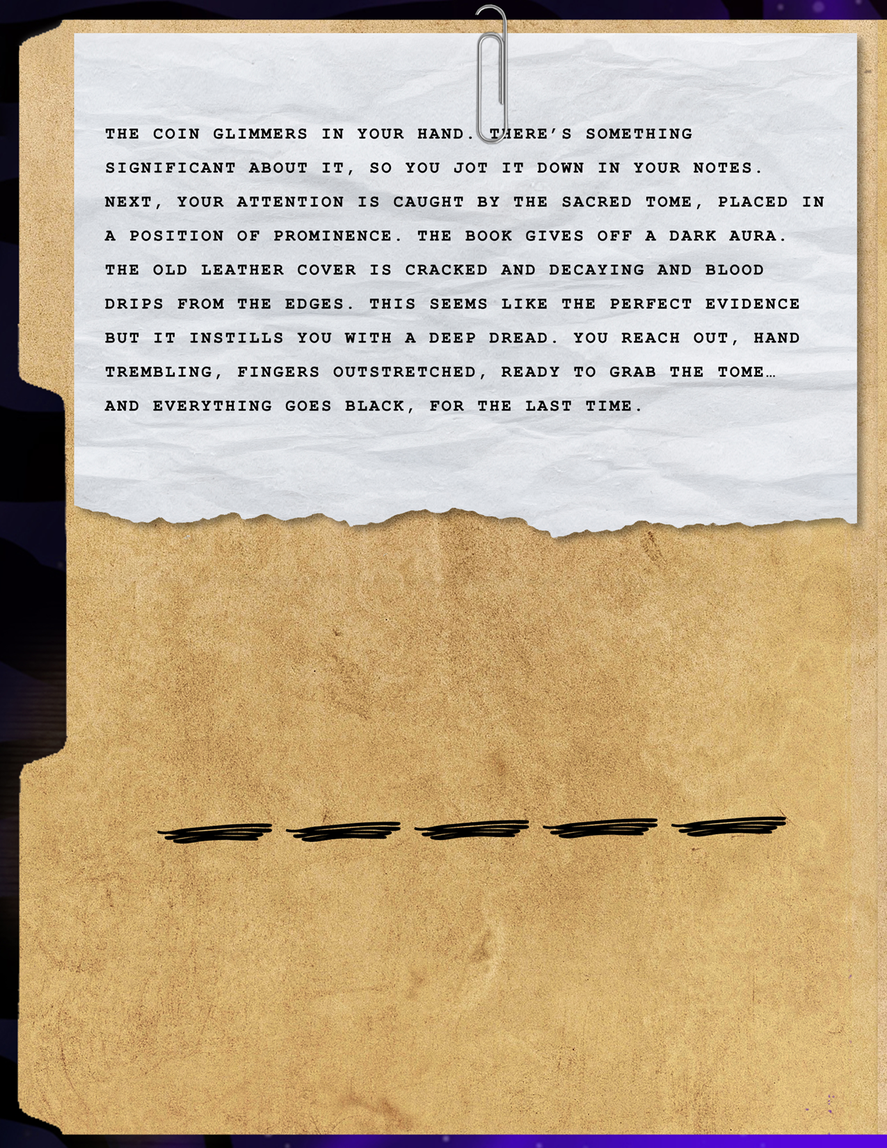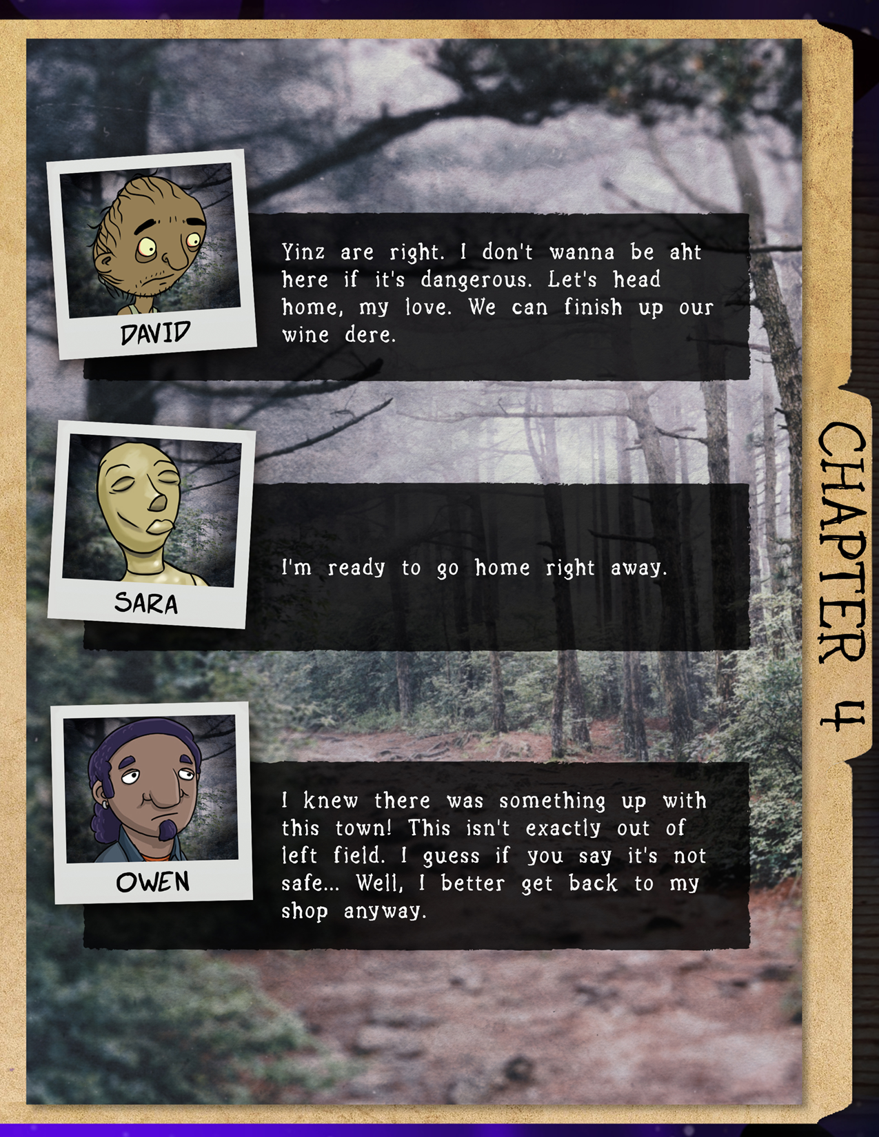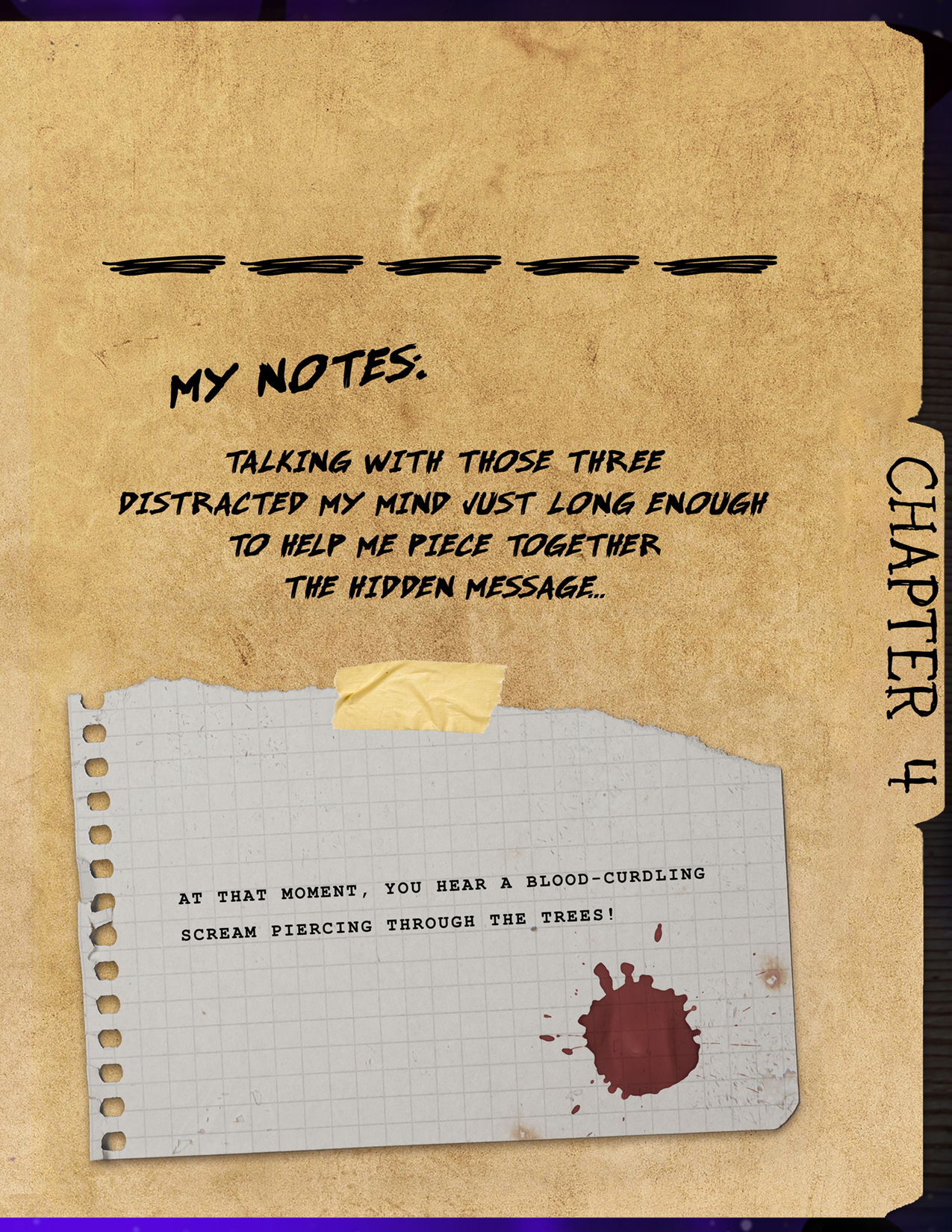Final Story: Talking with those three distracted your mind just long enough to help you piece together the hidden message. At that moment, you hear a blood-curdling scream piercing through the trees!