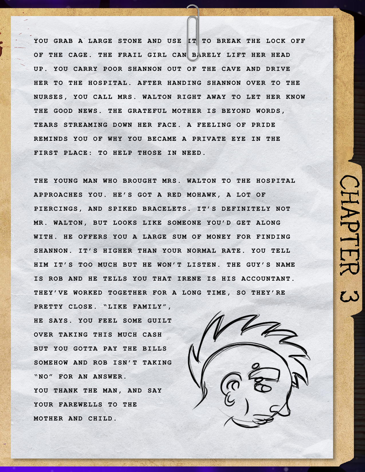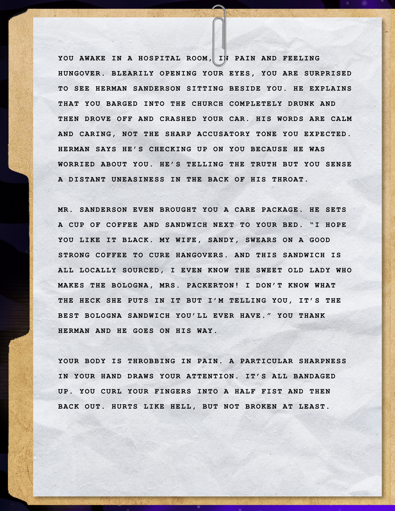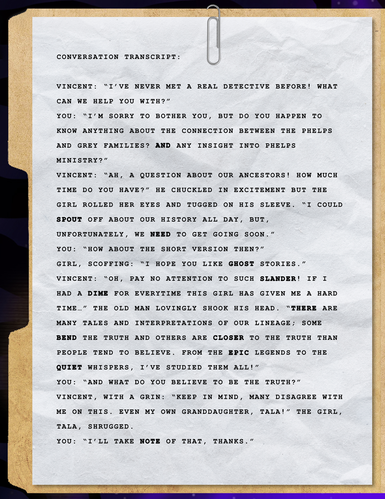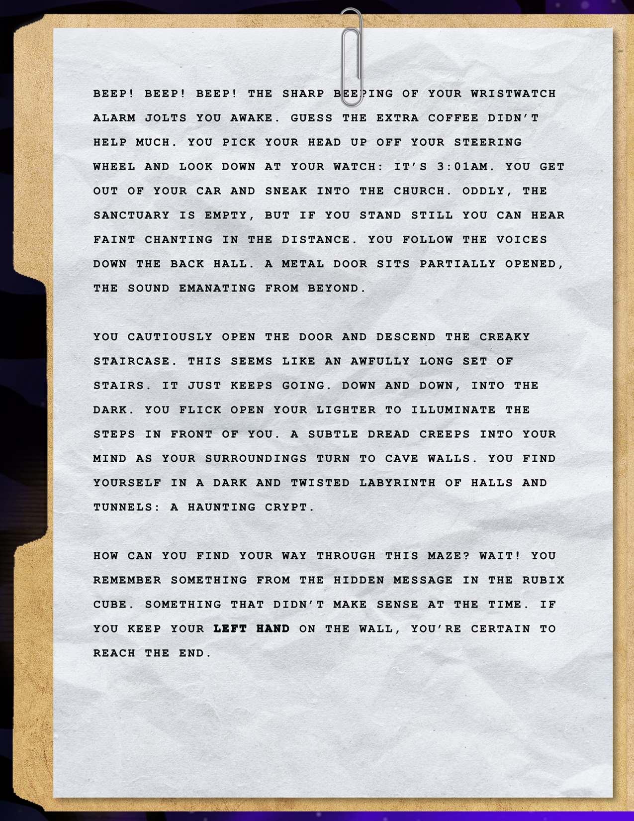 Final Story: Talking with those three distracted your mind just long enough to help you piece together the hidden message. At that moment, you hear a blood-curdling scream piercing through the trees!