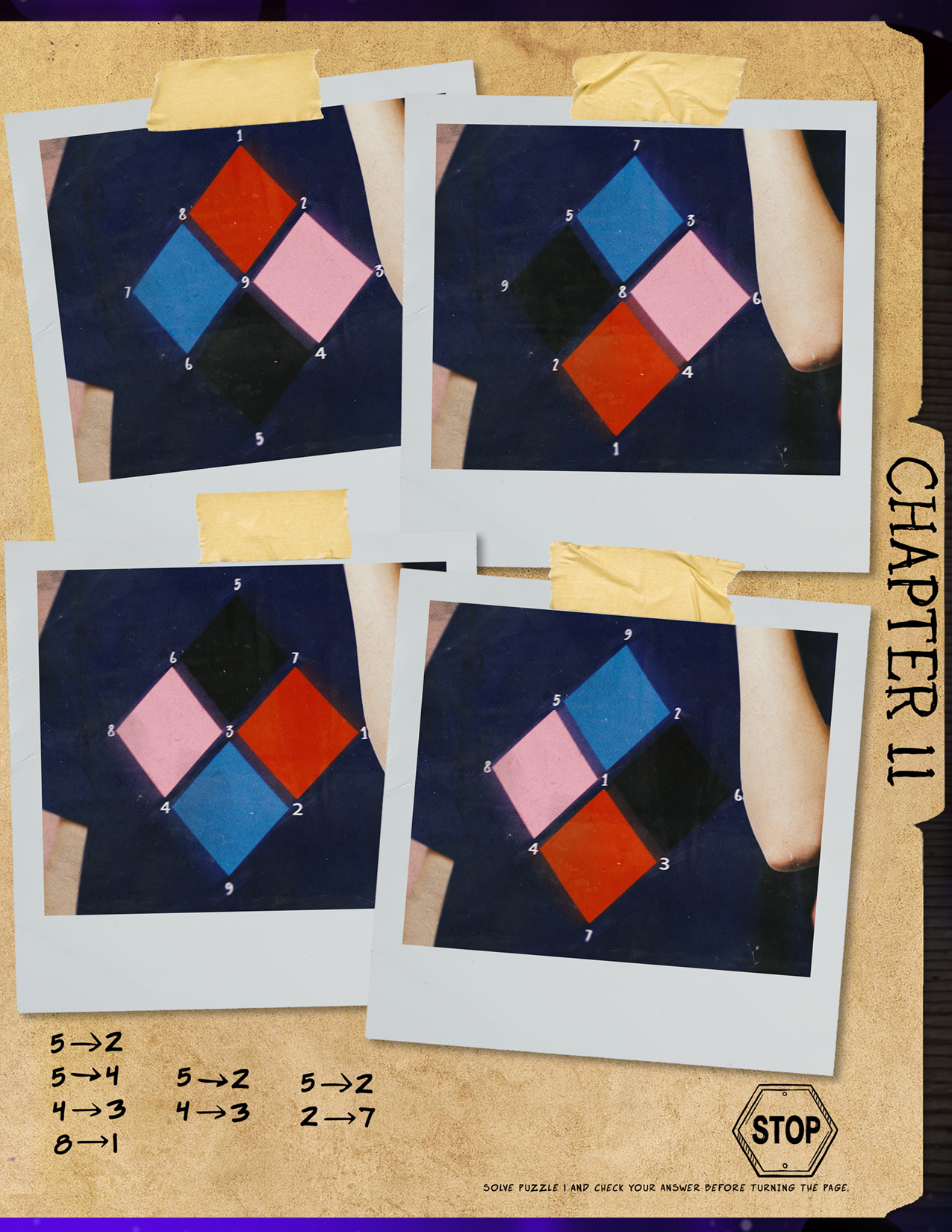 First identify the correct image of the four diamond patterns. The correct image matches the colour order of the Box 11 t-shirt (blue on top, then black, red and pink as you proceed clockwise). Next, draw lines to connect the numbers as shown in the graphic. I.e. connect 5 to 2, 5 to 4, etc. This will create 3 figures which is the phrase: E = 7.
