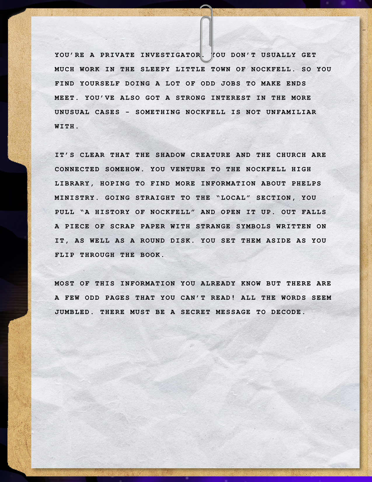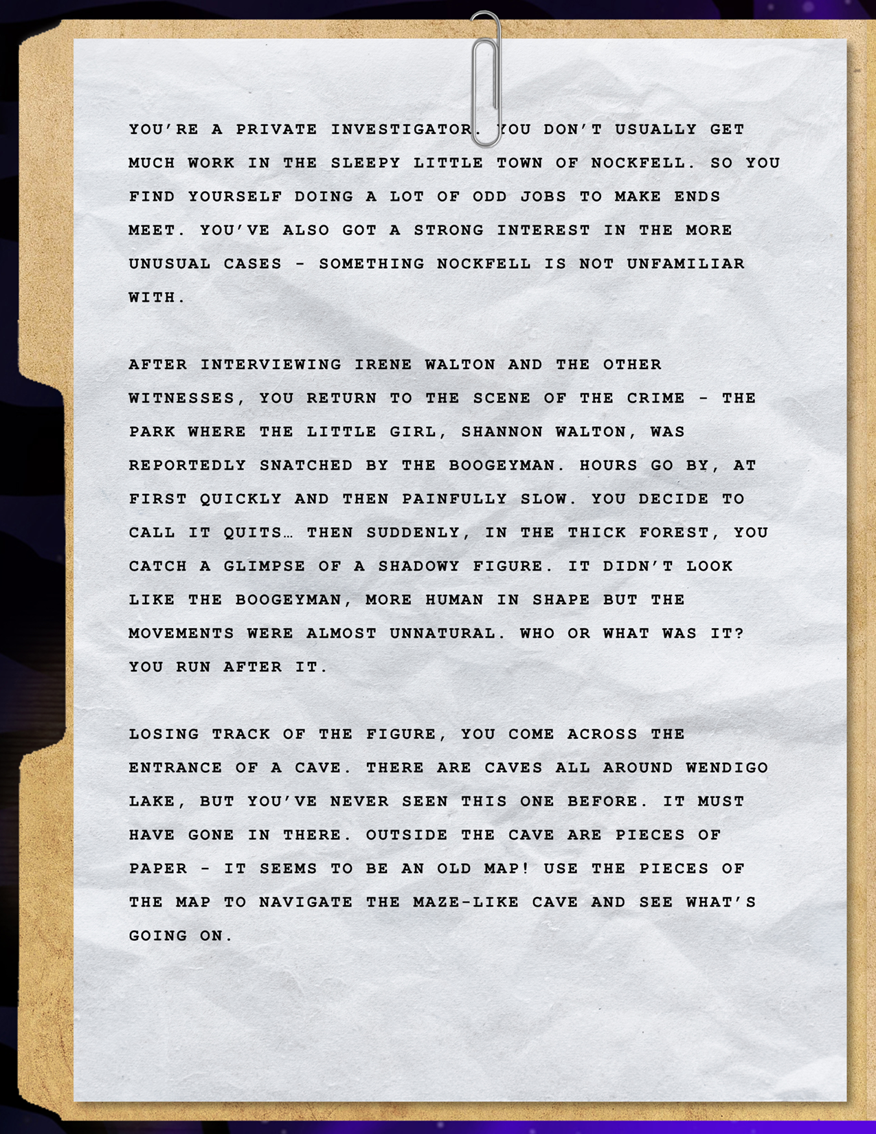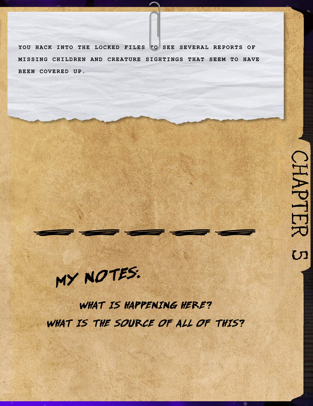 Final Story: You hack into the locked files to see several reports of missing children and creature sightings that seem to have been covered up. What is happening here? What is the source of all of this?