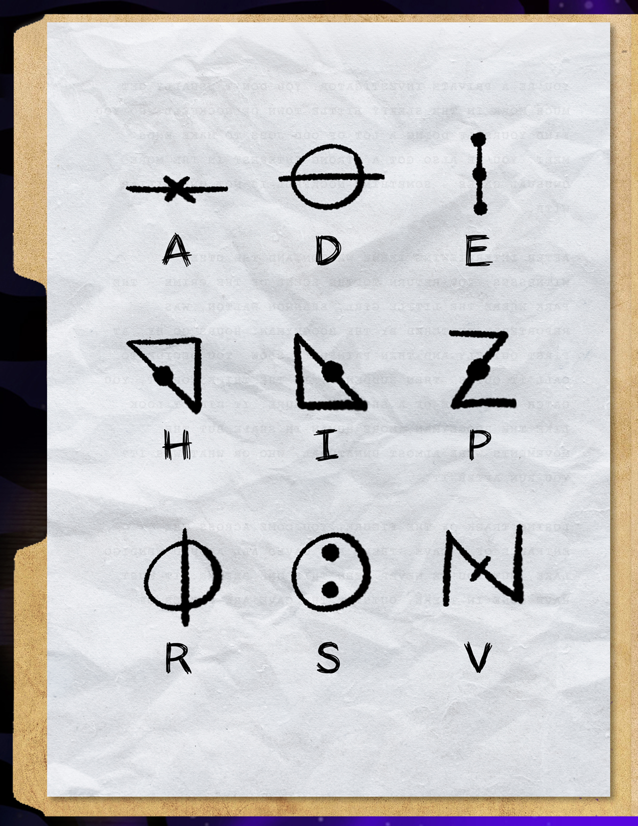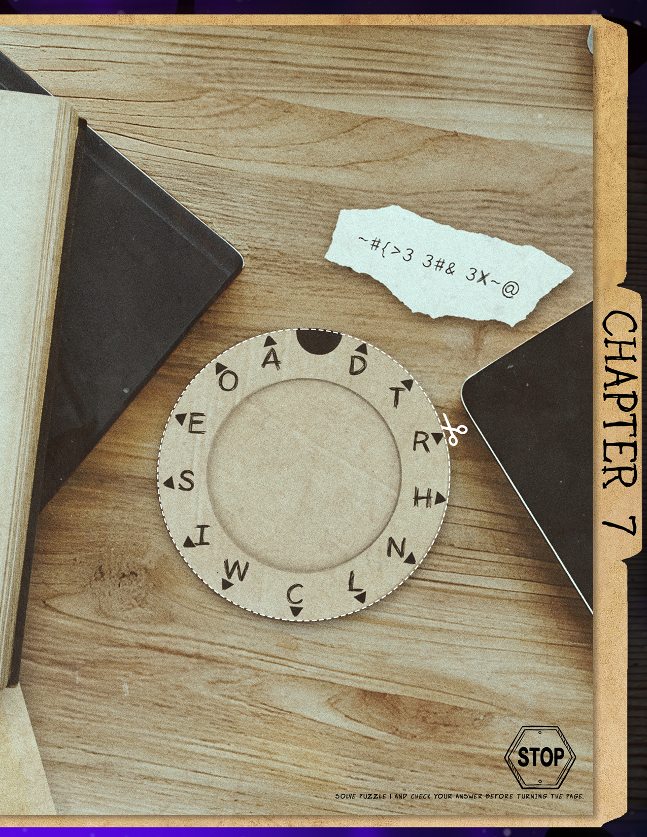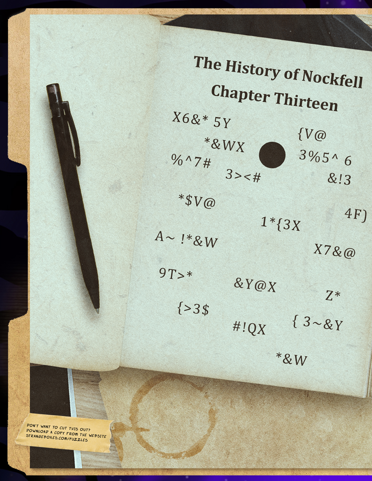 Lay the decoder wheel over the History of Nockfell page, lining up the solid circles. Each letter on the wheel should point to a different symbol on the page.
