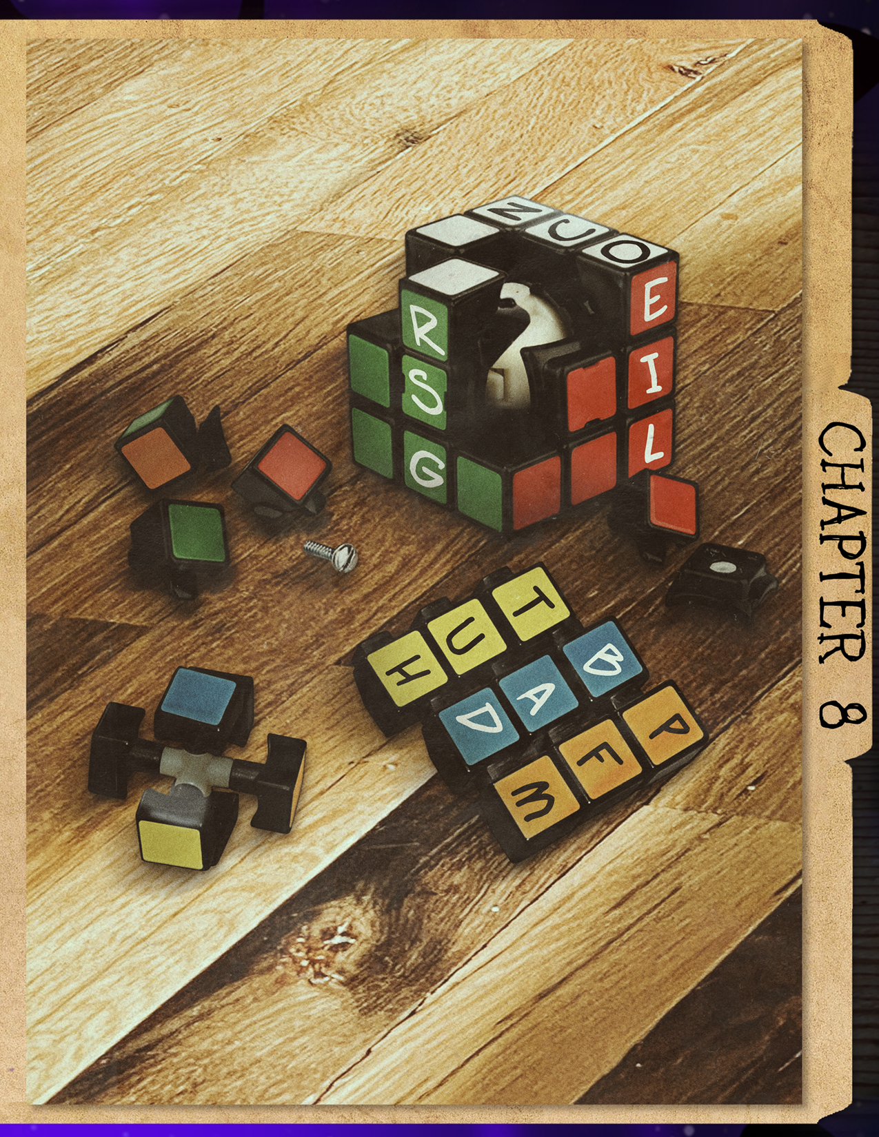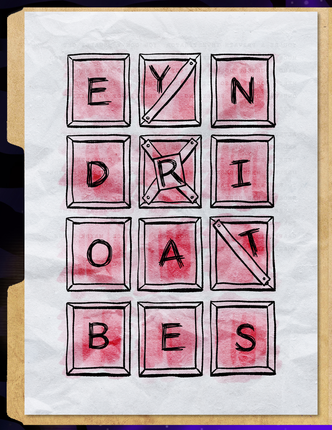 The grid of letters in the booklet is the same dimensions as the windows on the apartment building, as depicted on the art print and t-shirt. There is also a skull on the building as in the solution from the previous puzzle. In the dialogue, the characters mention 5 directions: RIGHT, UP, RIGHT, UP, LEFT. When you start to the bottom left of the letter grid (where the skull is in the art), following the directions takes you to the letters B O A R D.