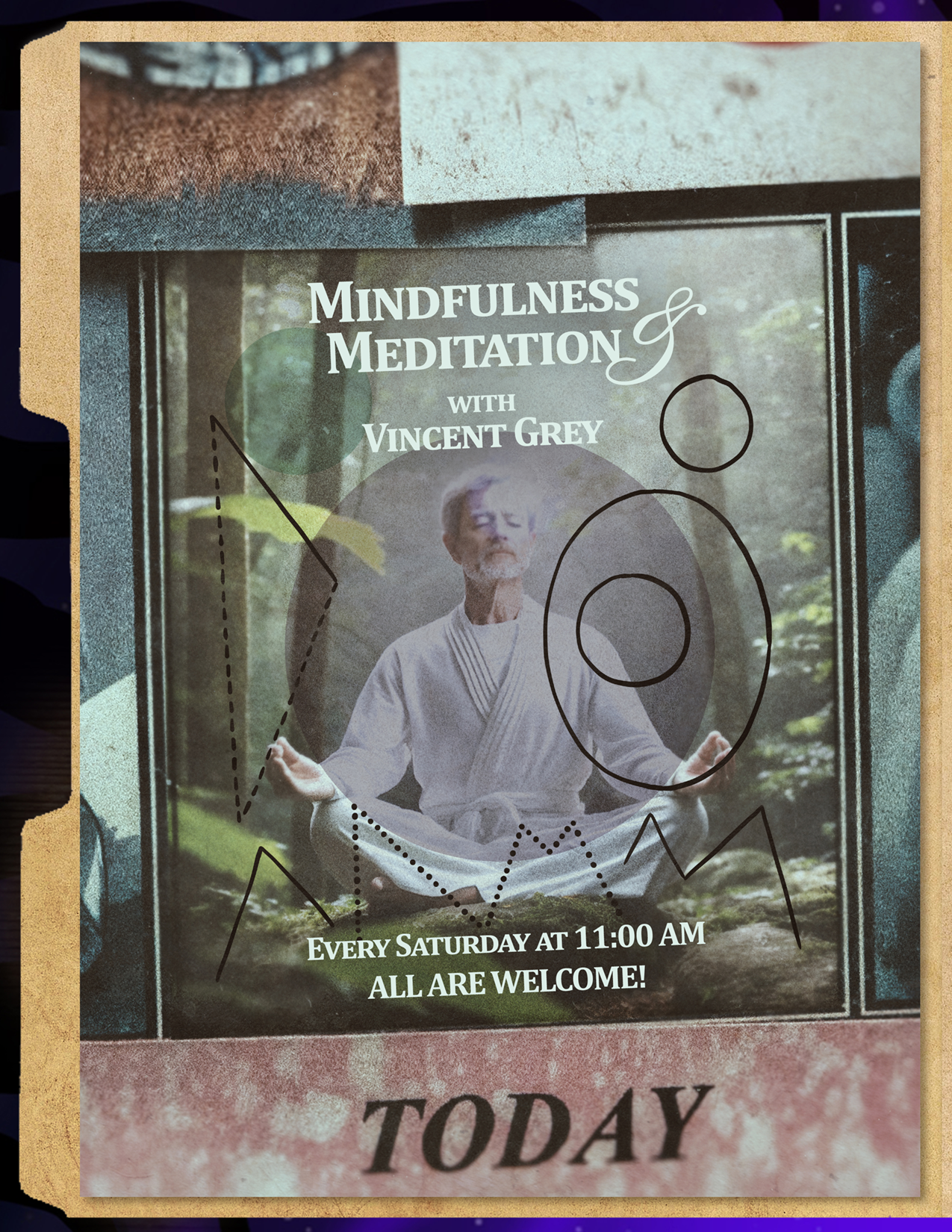 Flip the decoder wheel to the side with various lines, not letters. Place the decoder wheel over the central circle on the meditation poster. Rotate the wheel until the solid lines on the wheel connect with those on the poster. Repeat twice more for the dotted and dashed lines.
