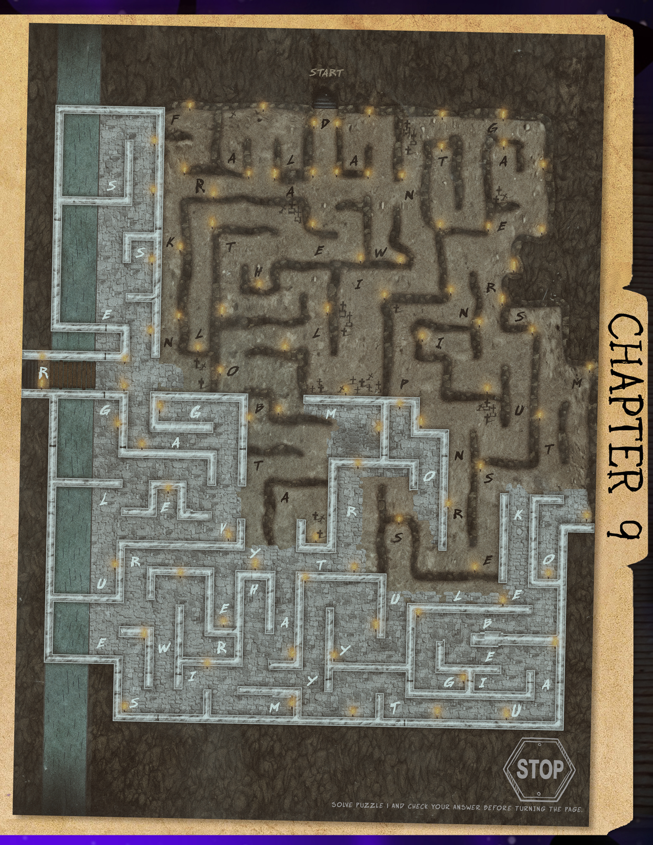 Navigate the maze as if your left hand was constantly on the wall, following the path through the maze and taking note of all letters along the way. Six words are revealed as the solution: DANGER, UNREST, SMOKE, BEAUTY, MISERY, VULGAR.